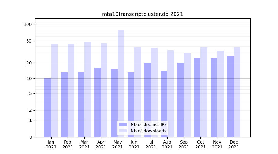 mta10transcriptcluster.db_2021_stats.tab| Month | Nb of distinct IPs | Nb of downloads |
