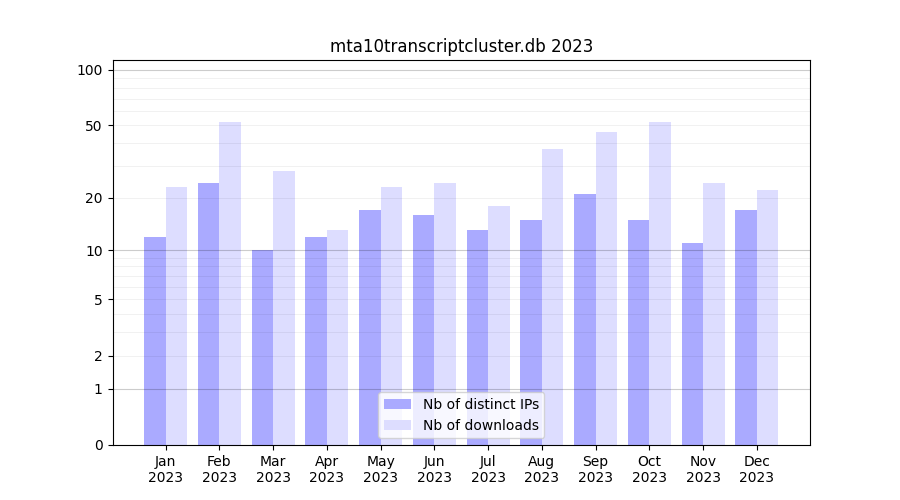 mta10transcriptcluster.db_2023_stats.tab| Month | Nb of distinct IPs | Nb of downloads |