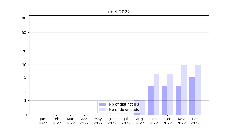Number of downloads for annotation package nnet, year by year, from 2025 back to 2014 (years with no downloads are omitted):