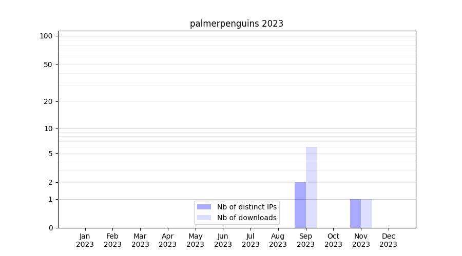 Number of downloads for annotation package palmerpenguins, year by year, from 2025 back to 2014 (years with no downloads are omitted):