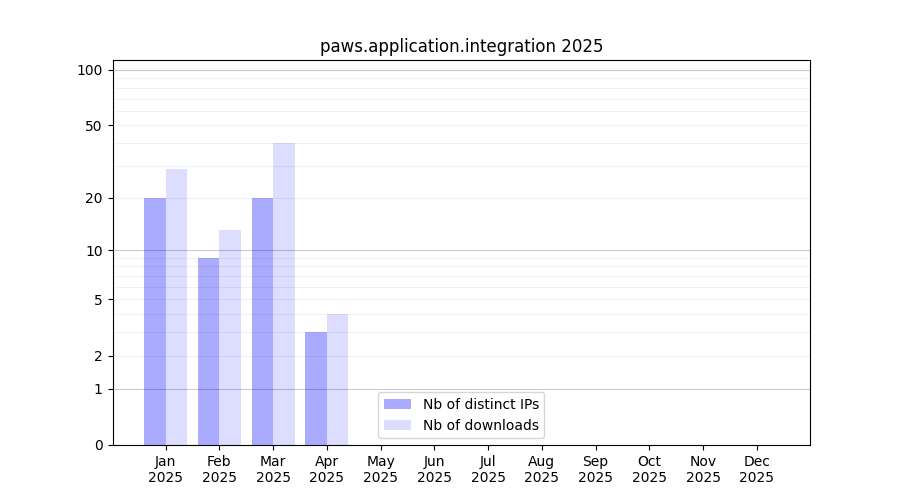 Number of downloads for annotation package paws.application.integration, year by year, from 2025 back to 2014 (years with no downloads are omitted):
