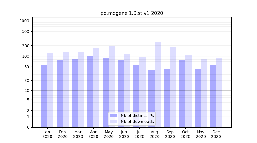 pd.mogene.1.0.st.v1_2020_stats.tab| Month | Nb of distinct IPs | Nb of downloads |