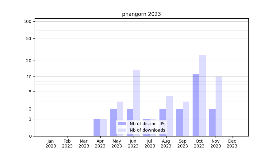 Number of downloads for annotation package phangorn, year by year, from 2025 back to 2014 (years with no downloads are omitted):