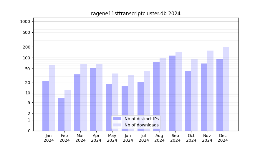 ragene11sttranscriptcluster.db_2024_stats.tab| Month | Nb of distinct IPs | Nb of downloads |