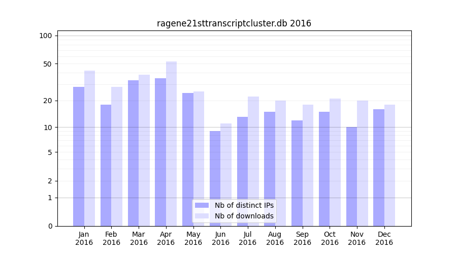 ragene21sttranscriptcluster.db_2016_stats.tab| Month | Nb of distinct IPs | Nb of downloads |