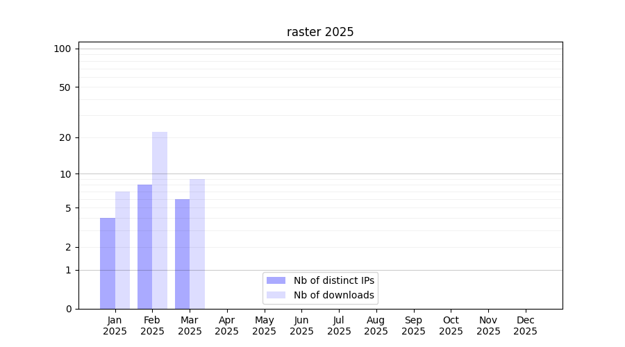 Number of downloads for annotation package raster, year by year, from 2025 back to 2014 (years with no downloads are omitted):