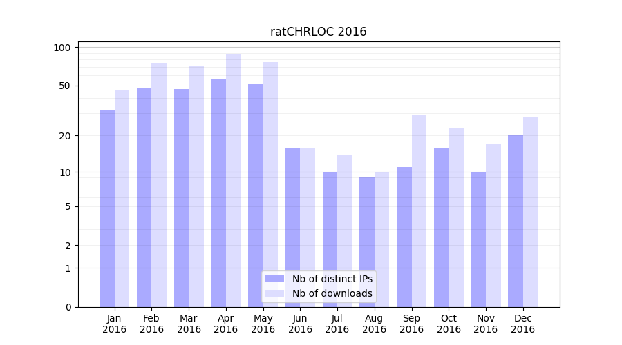 Number of downloads for annotation package ratCHRLOC, year by year, from 2025 back to 2014 (years with no downloads are omitted):