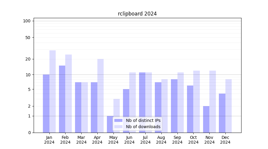 Number of downloads for annotation package rclipboard, year by year, from 2025 back to 2014 (years with no downloads are omitted):