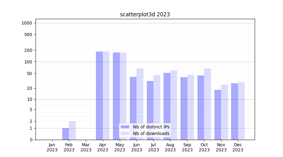 scatterplot3d_2023_stats.tab| Month | Nb of distinct IPs | Nb of downloads |