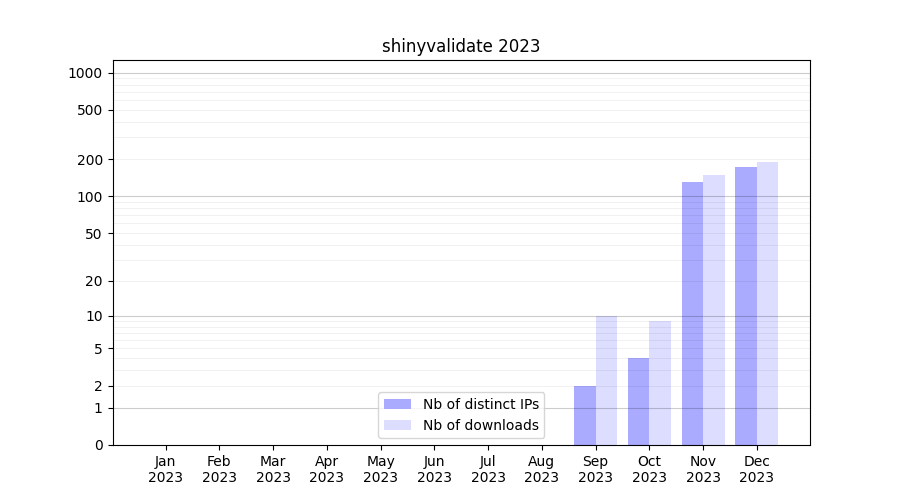 shinyvalidate_2023_stats.tab| Month | Nb of distinct IPs | Nb of downloads |