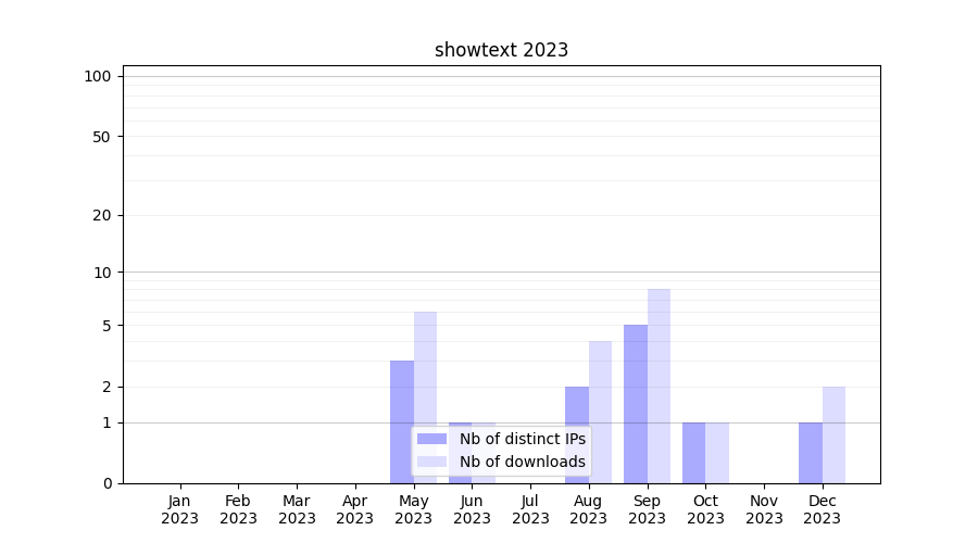 Number of downloads for annotation package showtext, year by year, from 2025 back to 2014 (years with no downloads are omitted):