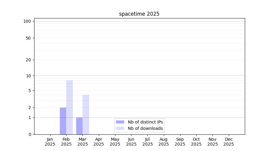 Number of downloads for annotation package spacetime, year by year, from 2025 back to 2014 (years with no downloads are omitted):
