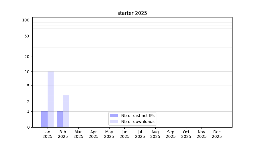 Number of downloads for annotation package starter, year by year, from 2025 back to 2014 (years with no downloads are omitted):