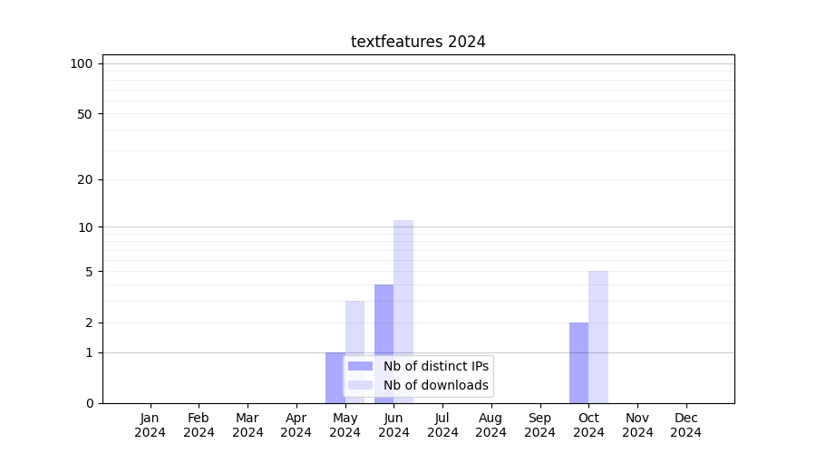 Number of downloads for annotation package textfeatures, year by year, from 2025 back to 2014 (years with no downloads are omitted):