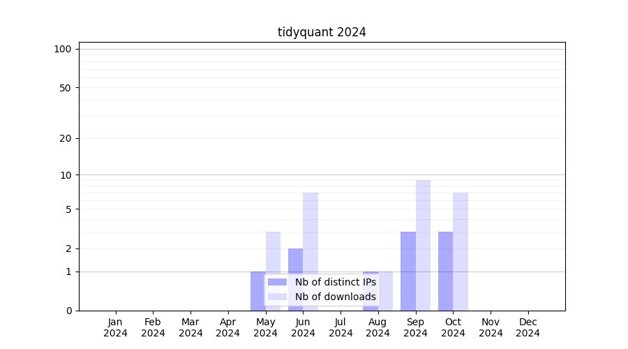 Number of downloads for annotation package tidyquant, year by year, from 2025 back to 2014 (years with no downloads are omitted):