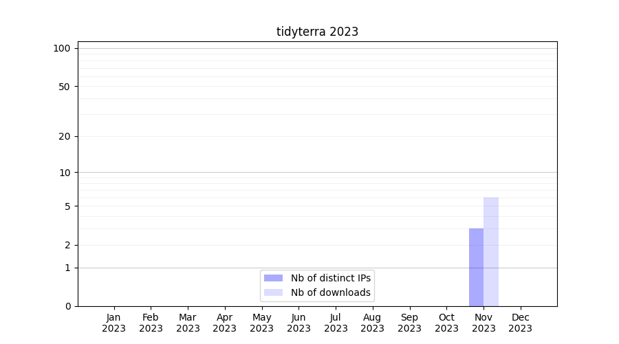 Number of downloads for annotation package tidyterra, year by year, from 2025 back to 2014 (years with no downloads are omitted):