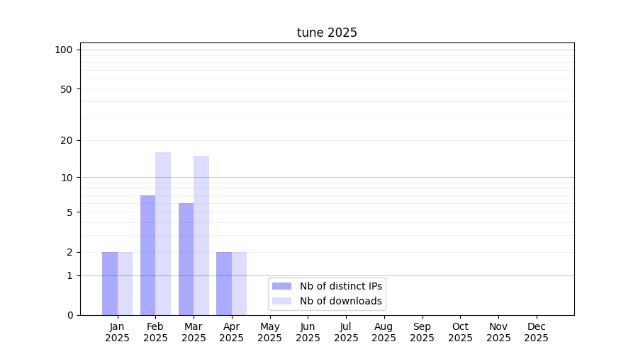 Number of downloads for annotation package tune, year by year, from 2025 back to 2014 (years with no downloads are omitted):