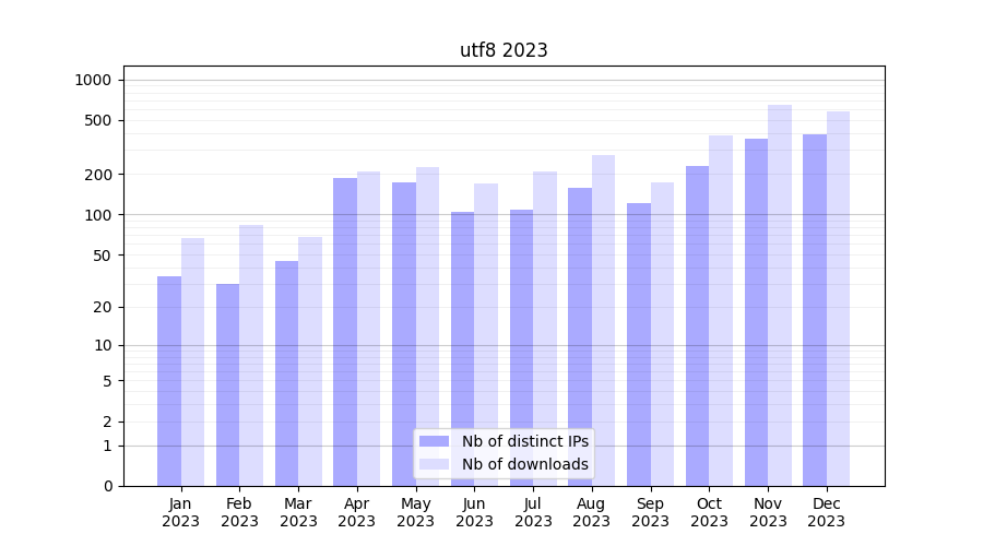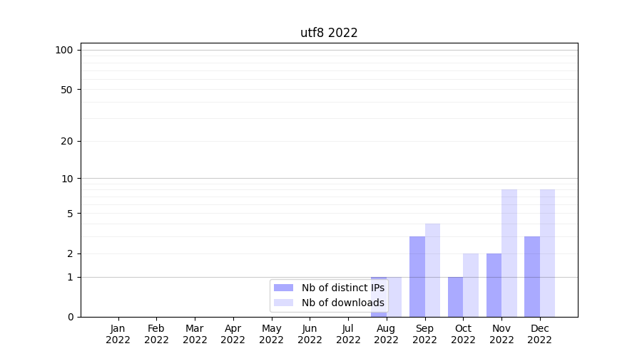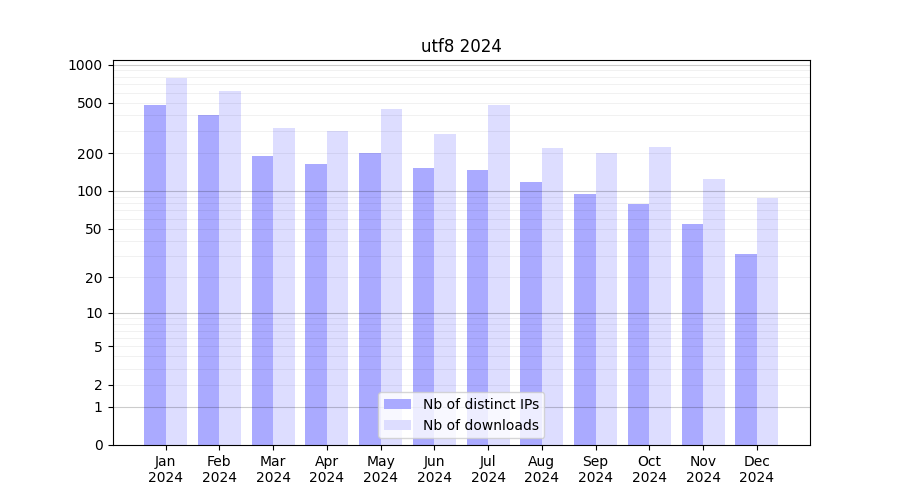 Number of downloads for annotation package utf8, year by year, from 2025 back to 2014 (years with no downloads are omitted):