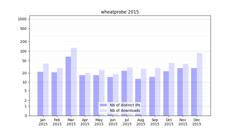 Number of downloads for annotation package wheatprobe, year by year, from 2025 back to 2014 (years with no downloads are omitted):