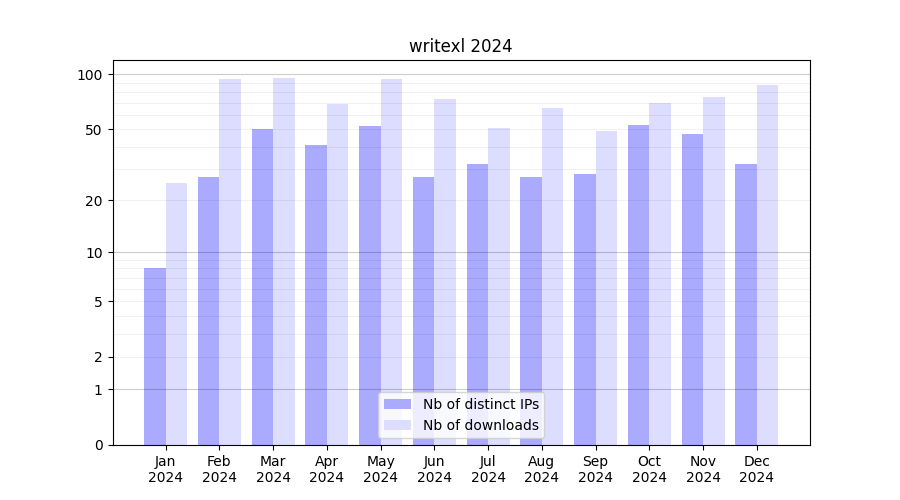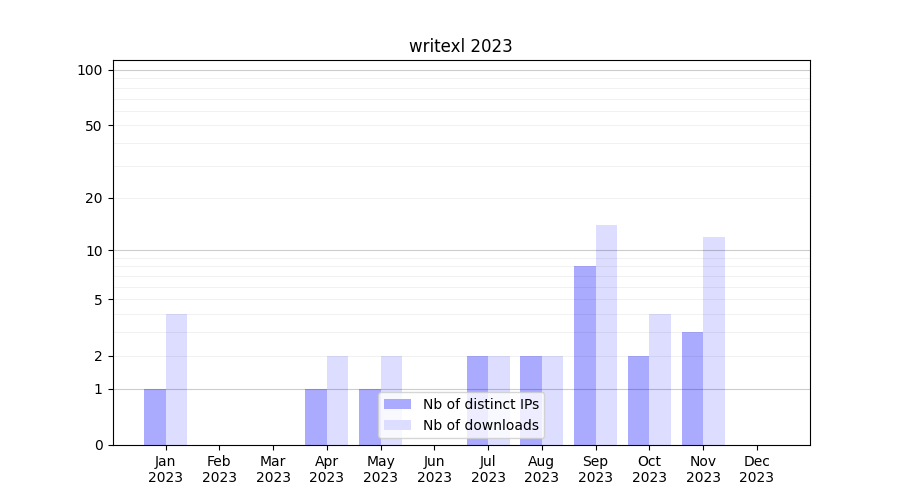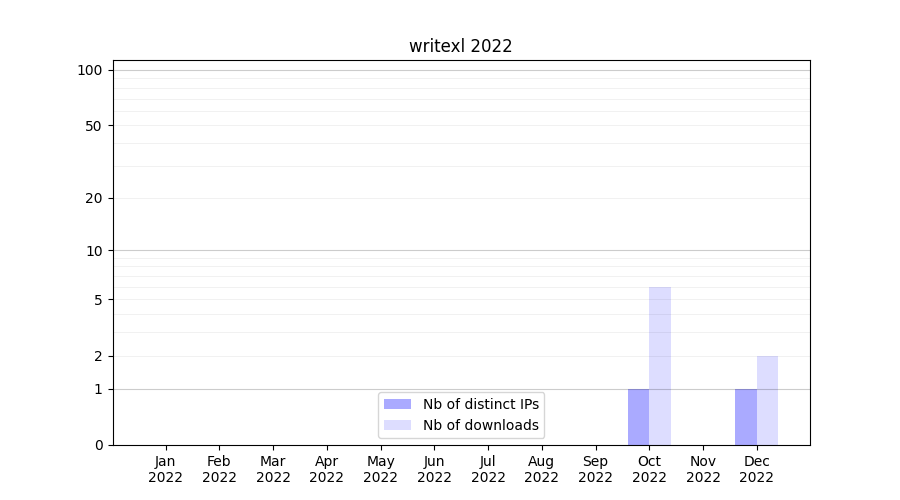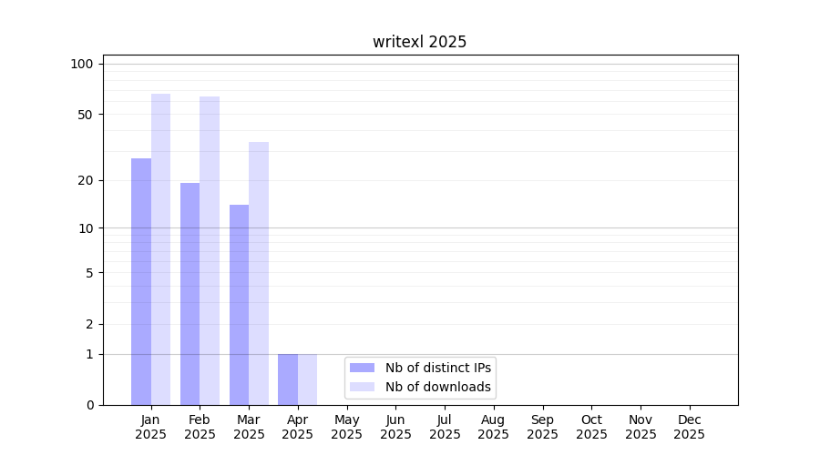 Number of downloads for annotation package writexl, year by year, from 2025 back to 2014 (years with no downloads are omitted):