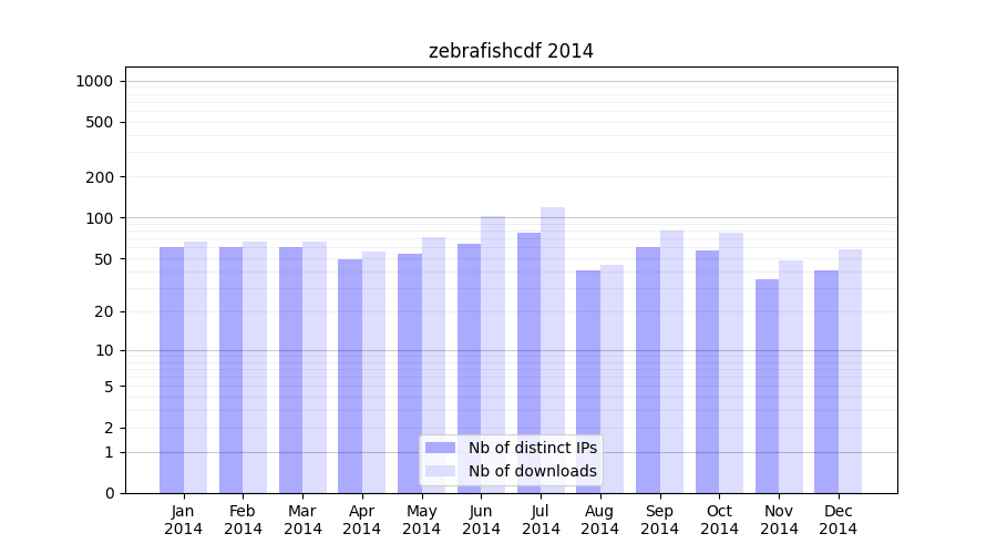 zebrafishcdf_2014_stats.tab| Month | Nb of distinct IPs | Nb of downloads |