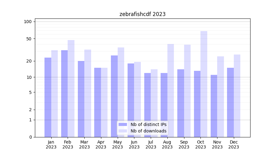zebrafishcdf_2023_stats.tab| Month | Nb of distinct IPs | Nb of downloads |