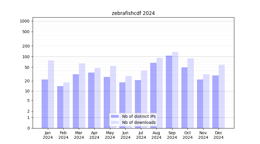 zebrafishcdf_2024_stats.tab| Month | Nb of distinct IPs | Nb of downloads |
