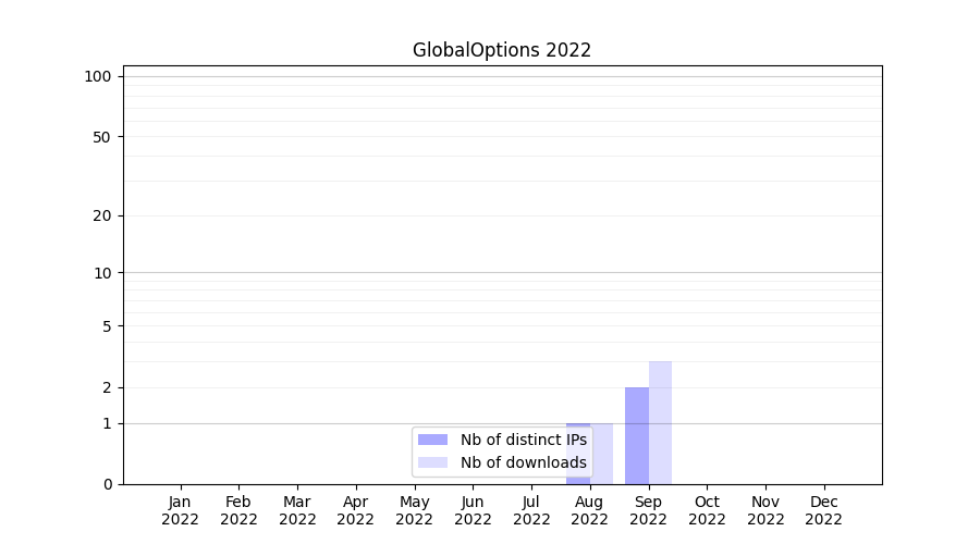 Number of downloads for experiment package GlobalOptions, year by year, from 2025 back to 2014 (years with no downloads are omitted):