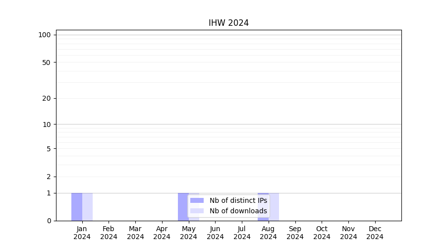 Number of downloads for experiment package IHW, year by year, from 2025 back to 2014 (years with no downloads are omitted):