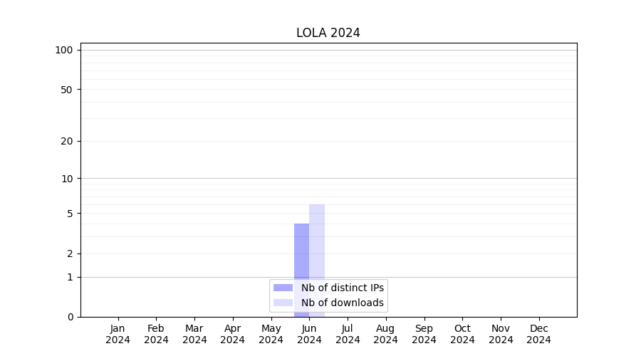 Number of downloads for experiment package LOLA, year by year, from 2025 back to 2014 (years with no downloads are omitted):