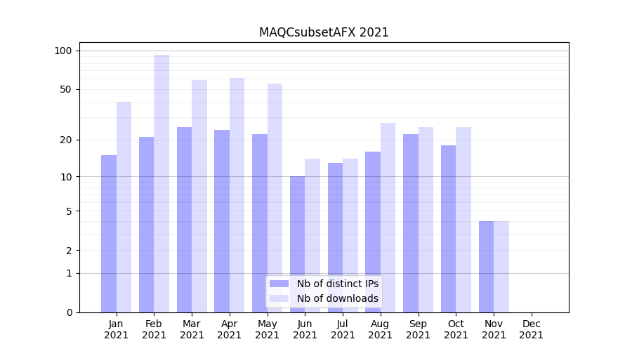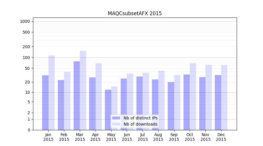 Number of downloads for experiment package MAQCsubsetAFX, year by year, from 2025 back to 2014 (years with no downloads are omitted):