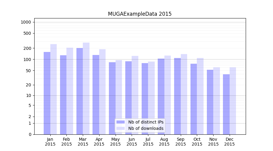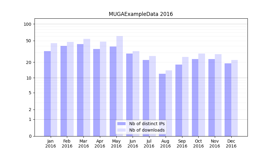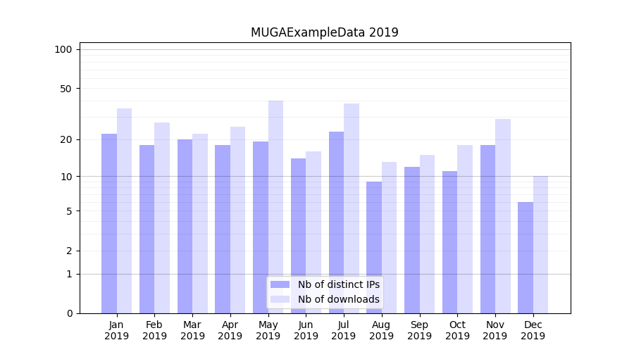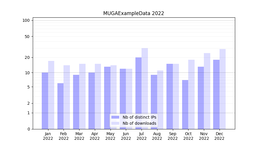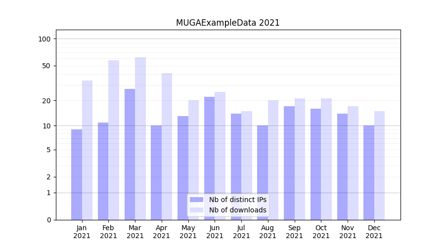 Number of downloads for experiment package MUGAExampleData, year by year, from 2025 back to 2014 (years with no downloads are omitted):