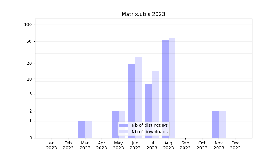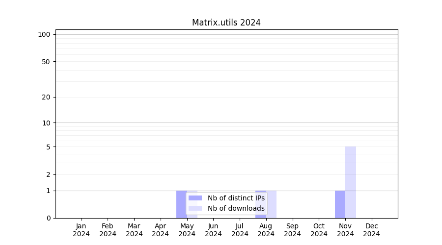 Number of downloads for experiment package Matrix.utils, year by year, from 2025 back to 2014 (years with no downloads are omitted):