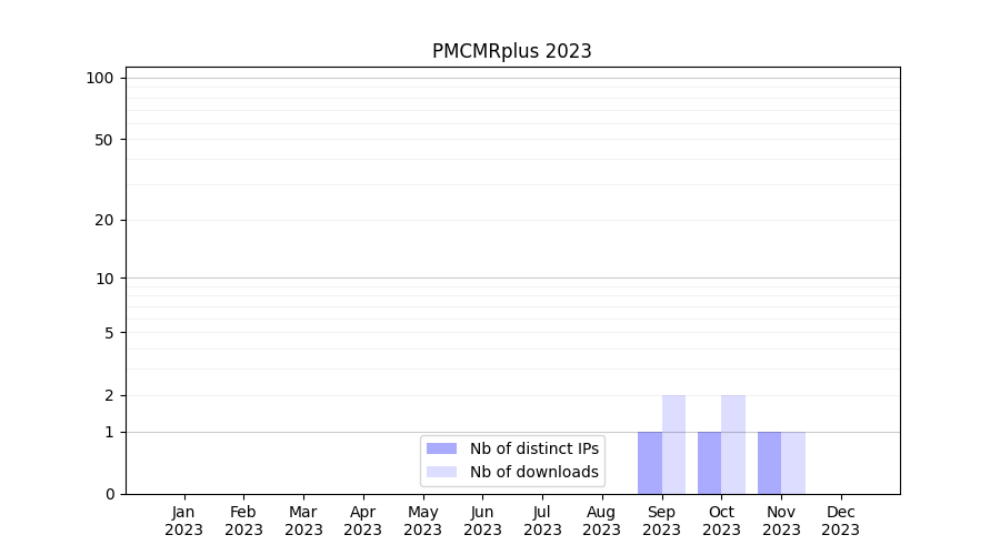 Number of downloads for experiment package PMCMRplus, year by year, from 2025 back to 2014 (years with no downloads are omitted):