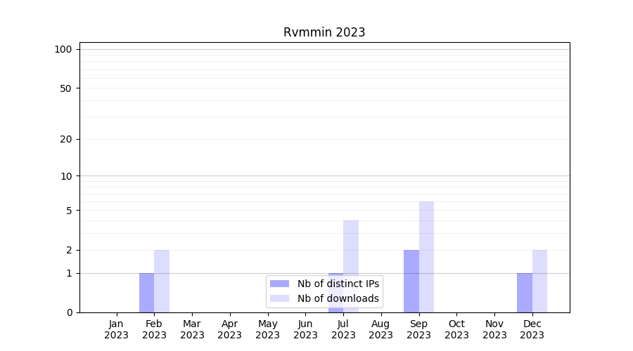 Number of downloads for experiment package Rvmmin, year by year, from 2025 back to 2014 (years with no downloads are omitted):