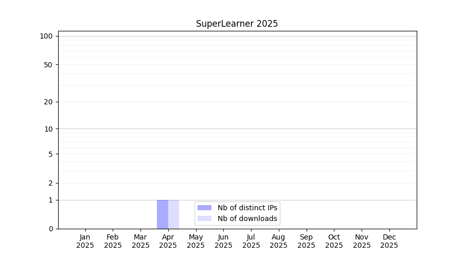 Number of downloads for experiment package SuperLearner, year by year, from 2025 back to 2014 (years with no downloads are omitted):