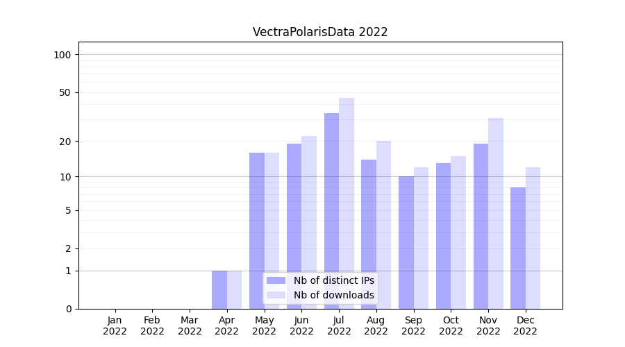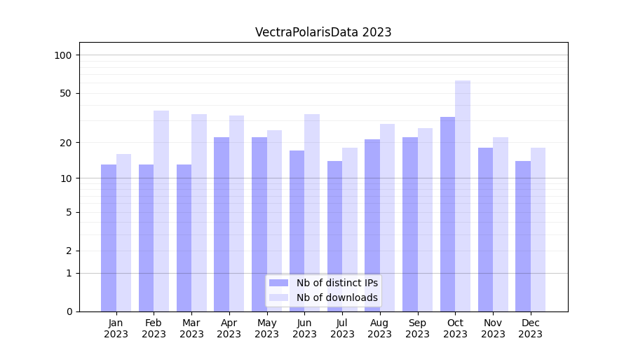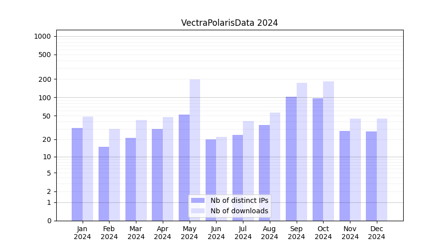 Number of downloads for experiment package VectraPolarisData, year by year, from 2025 back to 2014 (years with no downloads are omitted):