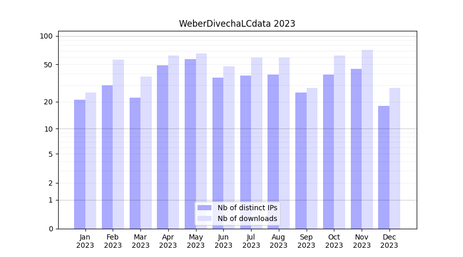 Number of downloads for experiment package WeberDivechaLCdata, year by year, from 2025 back to 2014 (years with no downloads are omitted):
