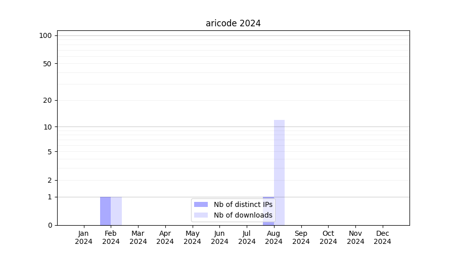 Number of downloads for experiment package aricode, year by year, from 2025 back to 2014 (years with no downloads are omitted):