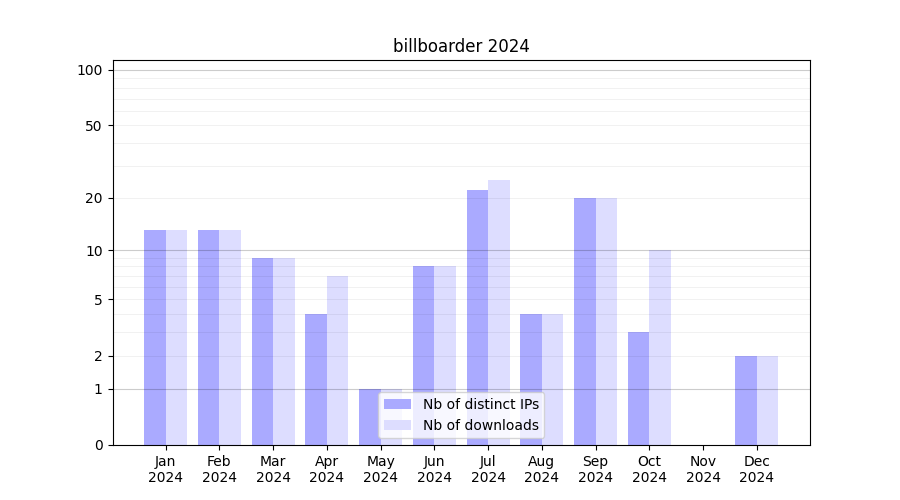 Number of downloads for experiment package billboarder, year by year, from 2025 back to 2014 (years with no downloads are omitted):