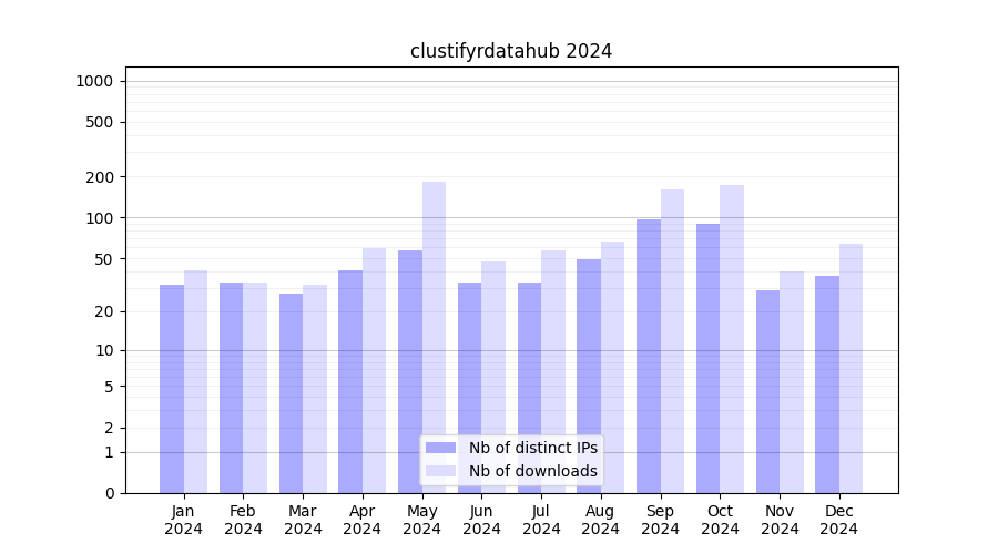 clustifyrdatahub_2024_stats.tab| Month | Nb of distinct IPs | Nb of downloads |