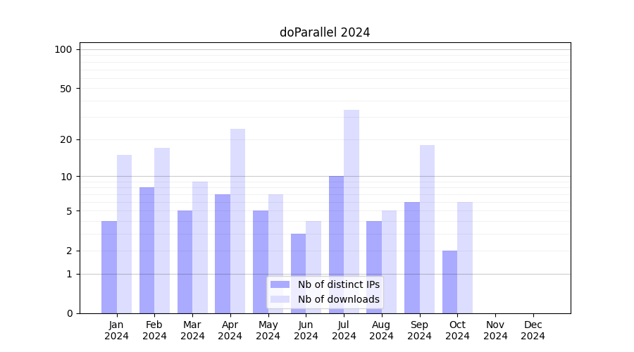 Number of downloads for experiment package doParallel, year by year, from 2025 back to 2014 (years with no downloads are omitted):