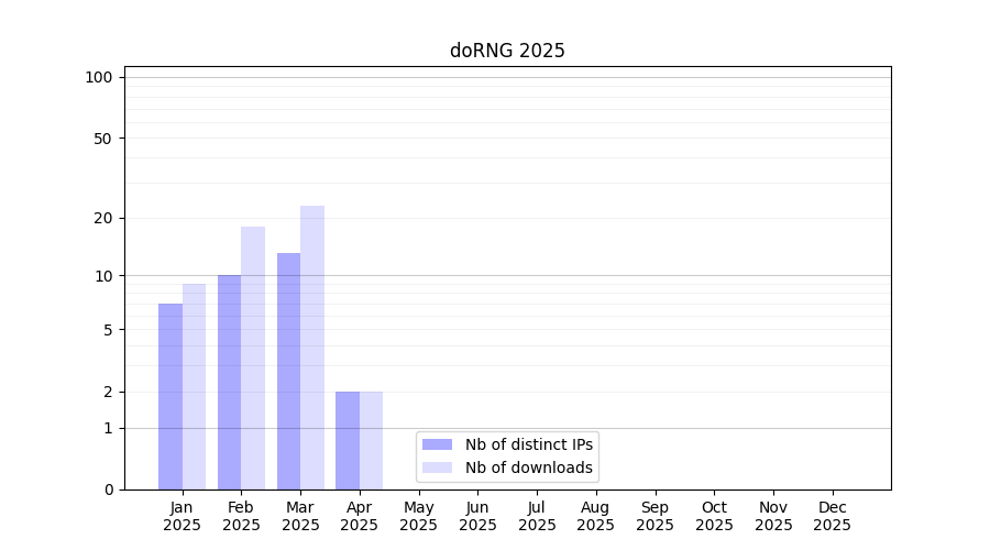 Number of downloads for experiment package doRNG, year by year, from 2025 back to 2014 (years with no downloads are omitted):