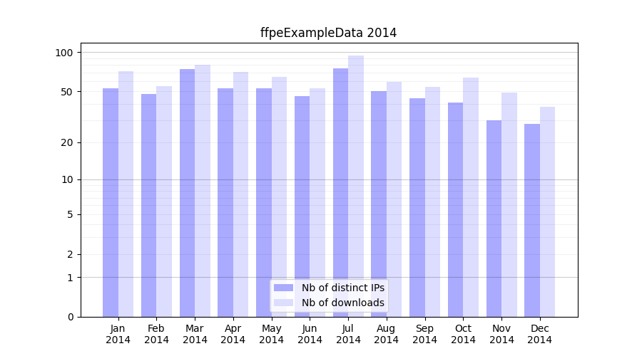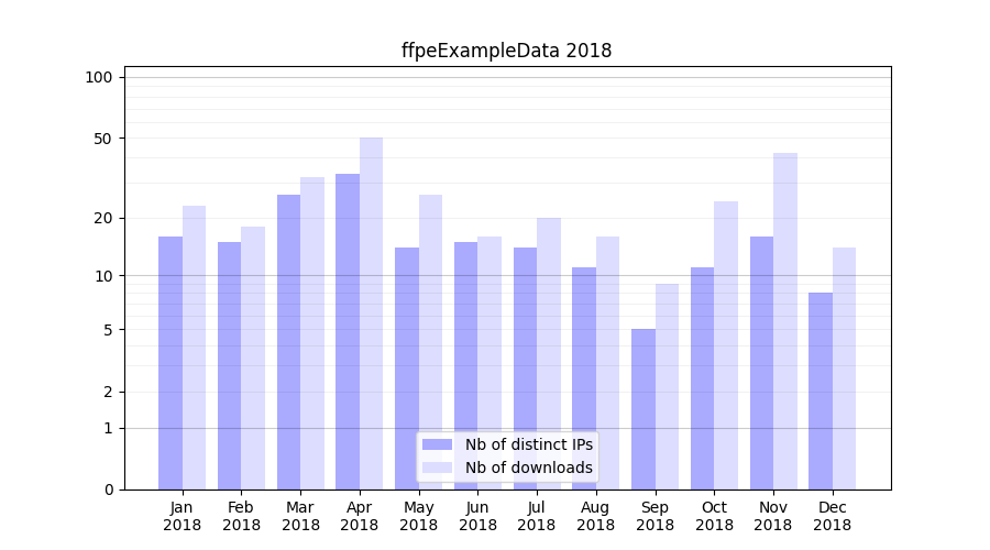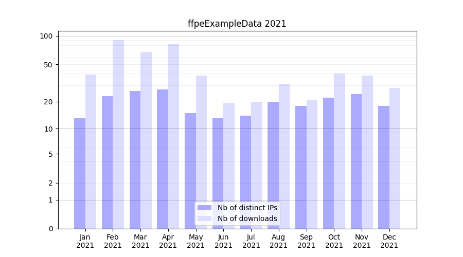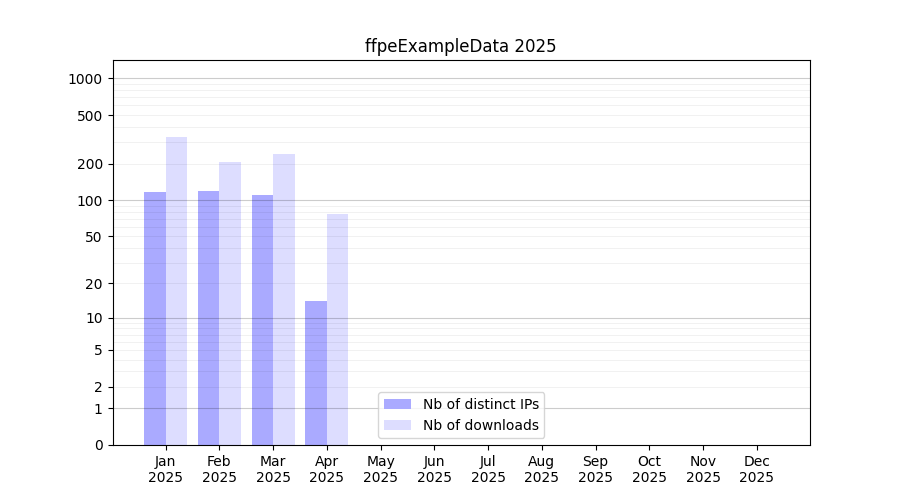 Number of downloads for experiment package ffpeExampleData, year by year, from 2025 back to 2014 (years with no downloads are omitted):