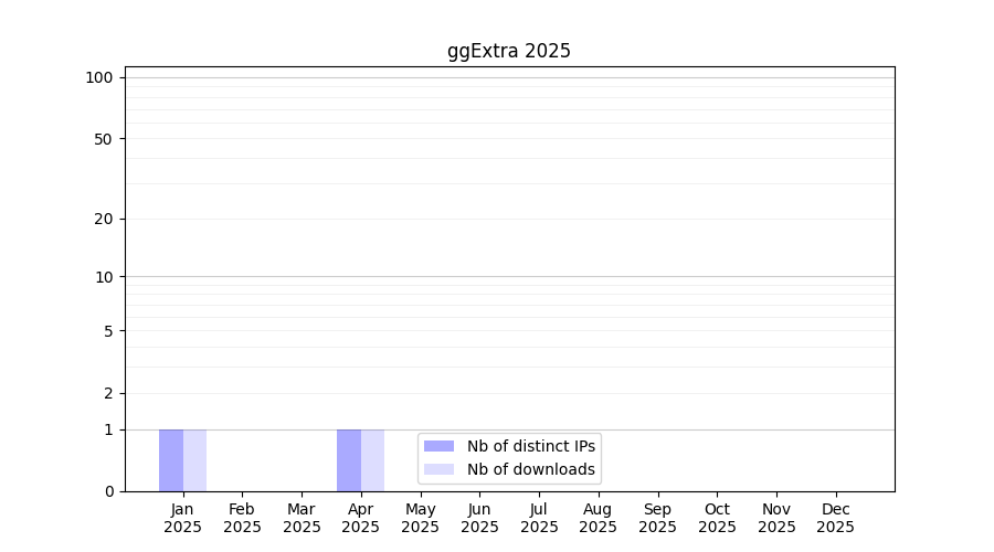 Number of downloads for experiment package ggExtra, year by year, from 2025 back to 2014 (years with no downloads are omitted):
