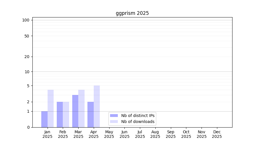Number of downloads for experiment package ggprism, year by year, from 2025 back to 2014 (years with no downloads are omitted):