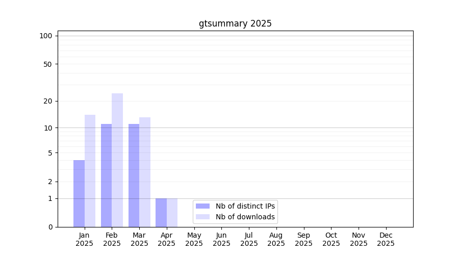 Number of downloads for experiment package gtsummary, year by year, from 2025 back to 2014 (years with no downloads are omitted):