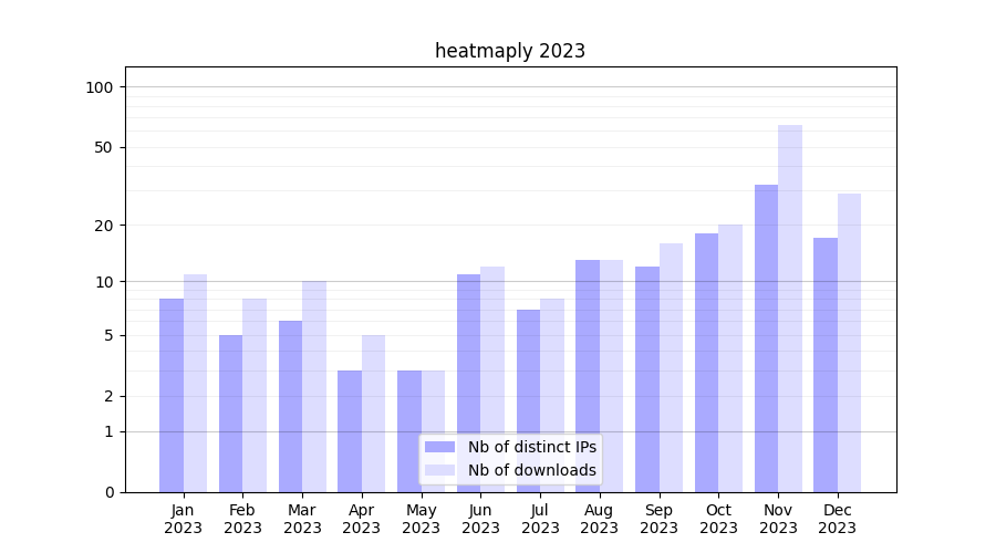 Number of downloads for experiment package heatmaply, year by year, from 2025 back to 2014 (years with no downloads are omitted):