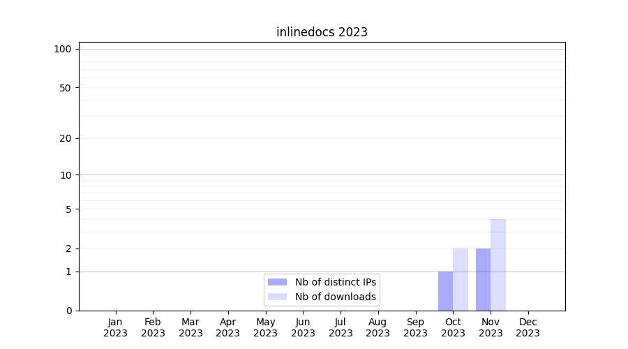Number of downloads for experiment package inlinedocs, year by year, from 2025 back to 2014 (years with no downloads are omitted):