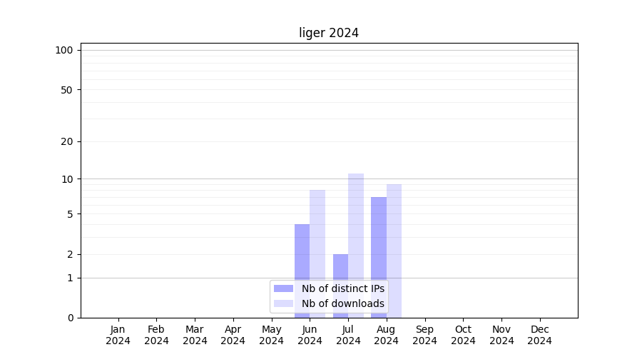 Number of downloads for experiment package liger, year by year, from 2025 back to 2014 (years with no downloads are omitted):